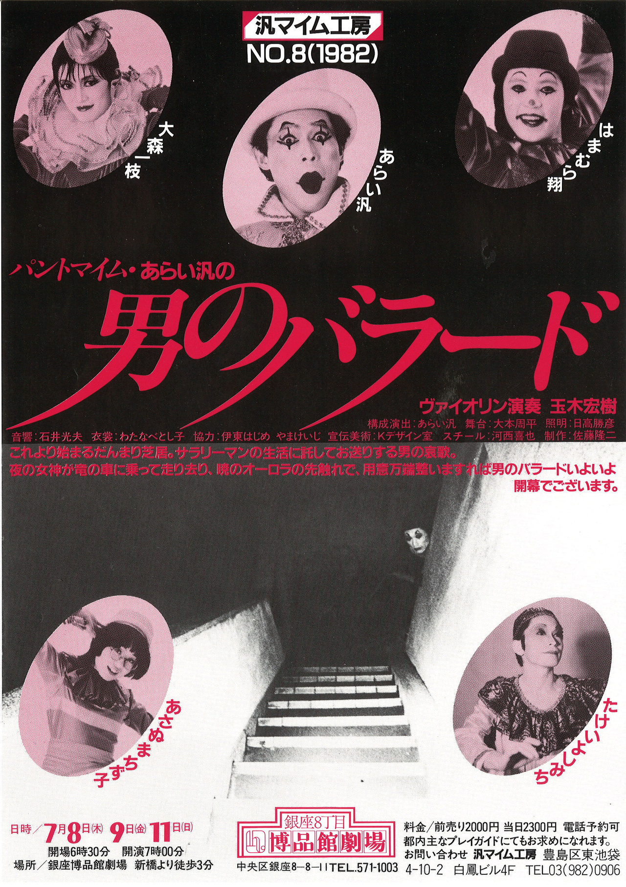 イタリア国際マイムフェスティバル参加。(1982年) あらい汎が最優秀マイムソリストを賞受賞。女クラウン(コロンビーヌ)に導かれたサラリーマンとその影が助け合い時に争い進行するマイム劇。擬音はすべておもちゃの楽器で演奏。サーカス小屋の演奏集団をイメージ。男のバラード・ラスト1.jpg 初演は、あらい汎、松元ヒロのコンビで六本木アトリエフォンテーヌで上演。その後池袋西武のなかにあったスタジオ200では、浜村翔(現・テンショウ)で上演。その男のバラード電話.jpg後にイタリア、アレツォのフェスティバルに招聘された作品。